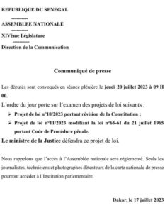 Les députés sont convoqués en séance plénière le jeudi 20 juillet 2023 à 09 H00. L’ordre du jour porte sur l’examen de deux projets de loi. Auteur/autrice de la publication :admin Publication publiée :17/07/2023 Post category:A LA UNE / Actualités / Politique / Société Vous devriez également aimer Conséquence des violences à l’UCAD : Près de 200.000 archives parties en fumée 11/06/2023 Sonko mérite notre respect ! 15/11/2024 À la suite de graves accusations à son encontre, Aida Mbodji répond fermement à Thierno Diop 15/10/2024